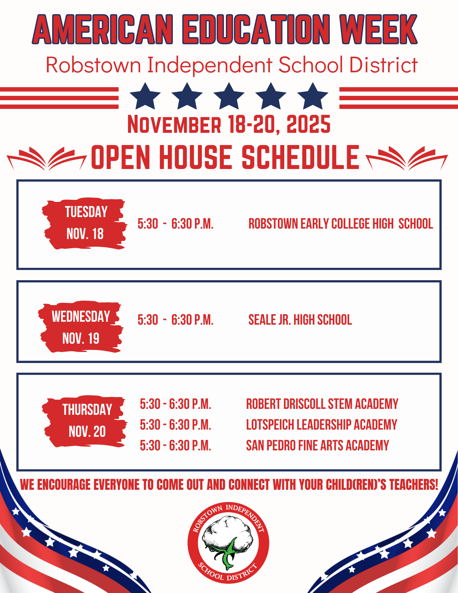 Robstown ISD invites families to attend this year’s Fall Open House events taking place across the district. This is a wonderful opportunity for parents and guardians to connect with their child’s teachers, explore classrooms, and see the exciting work students have accomplished this semester.