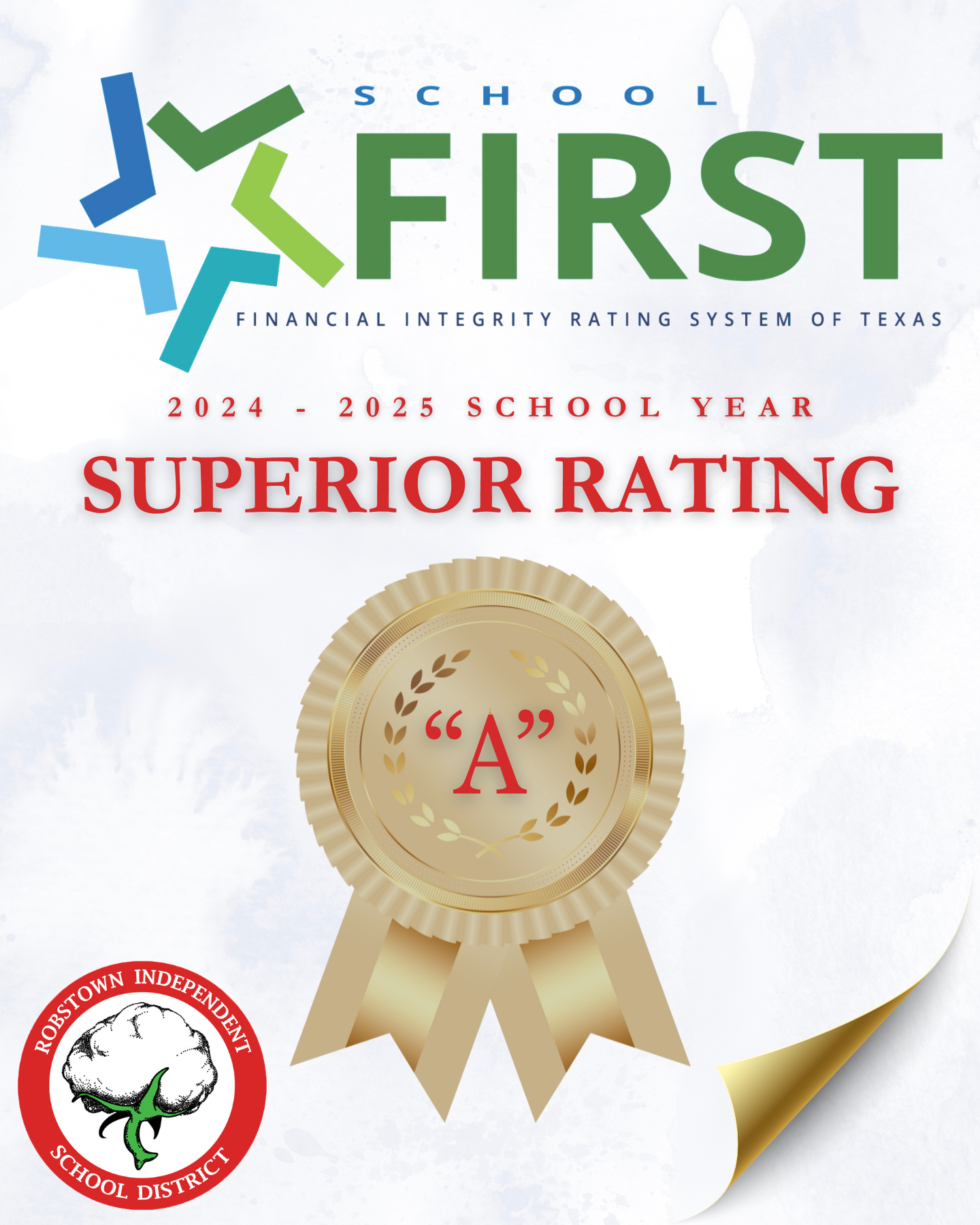 Robstown ISD is proud to announce that the district has once again earned an A – Superior Achievement rating on the School FIRST (Financial Integrity Rating System of Texas). This top rating reflects the district’s commitment to responsible budgeting, transparent financial practices, and overall fiscal excellence.