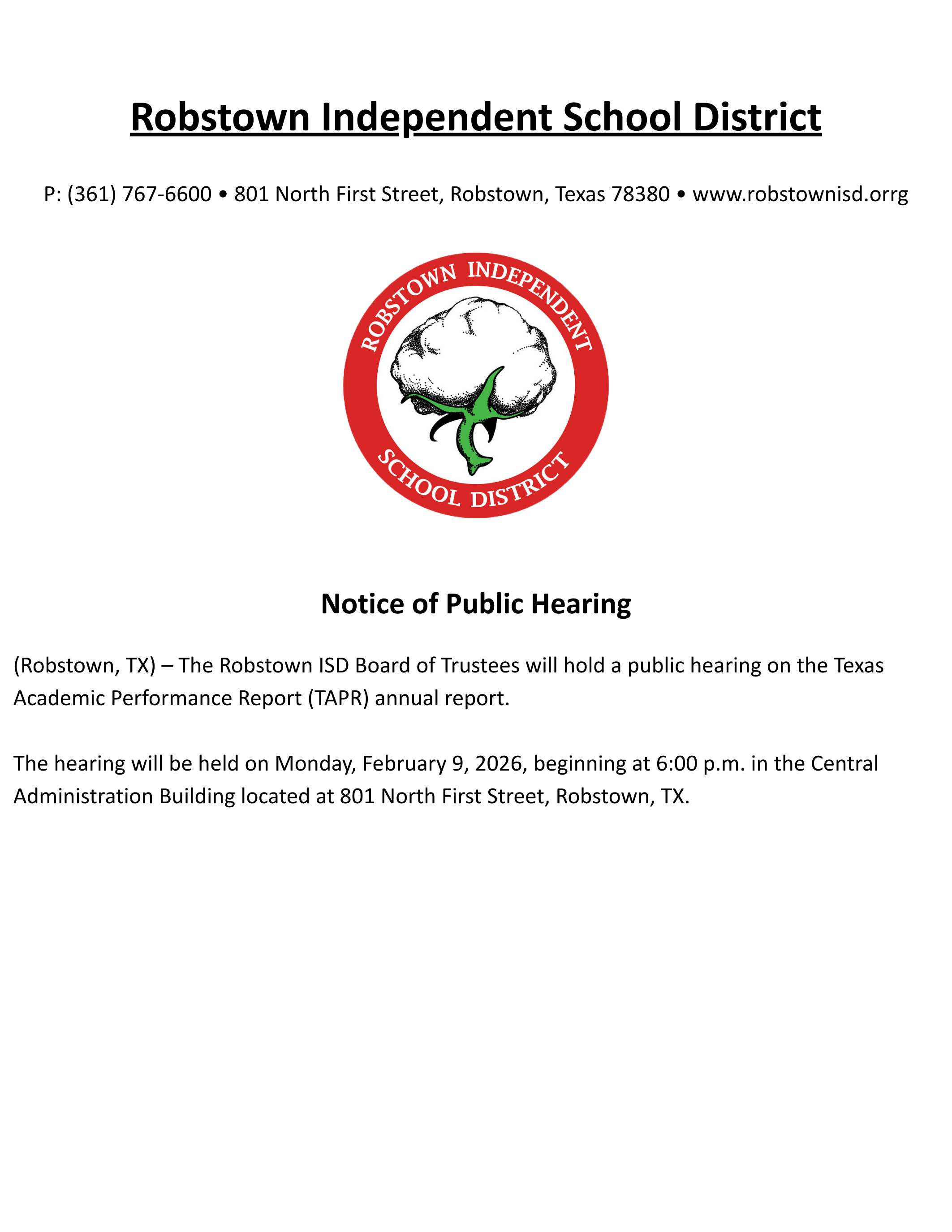 The hearing will take place on Monday, Feb. 9, 2026, beginning at 6 p.m., at the Central Administration Building, located at 801 N. First St. in Robstown.