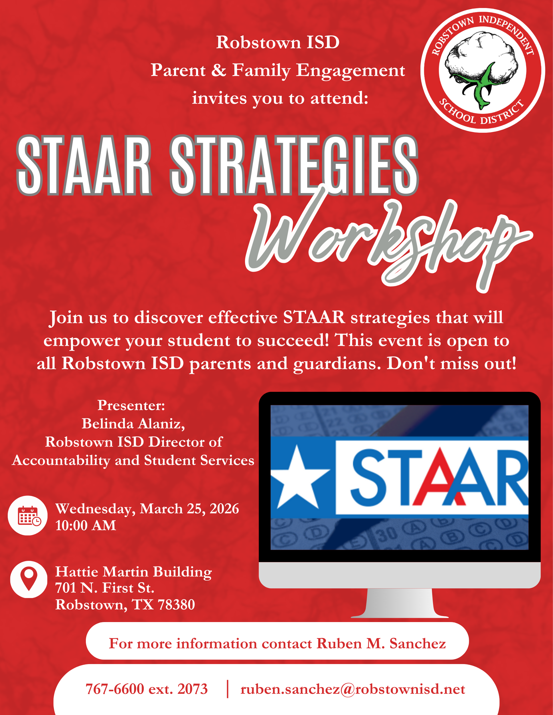 Robstown ISD Parent & Family Engagement invites all parents and guardians to attend an upcoming STAAR Strategy Workshop designed to support student success.