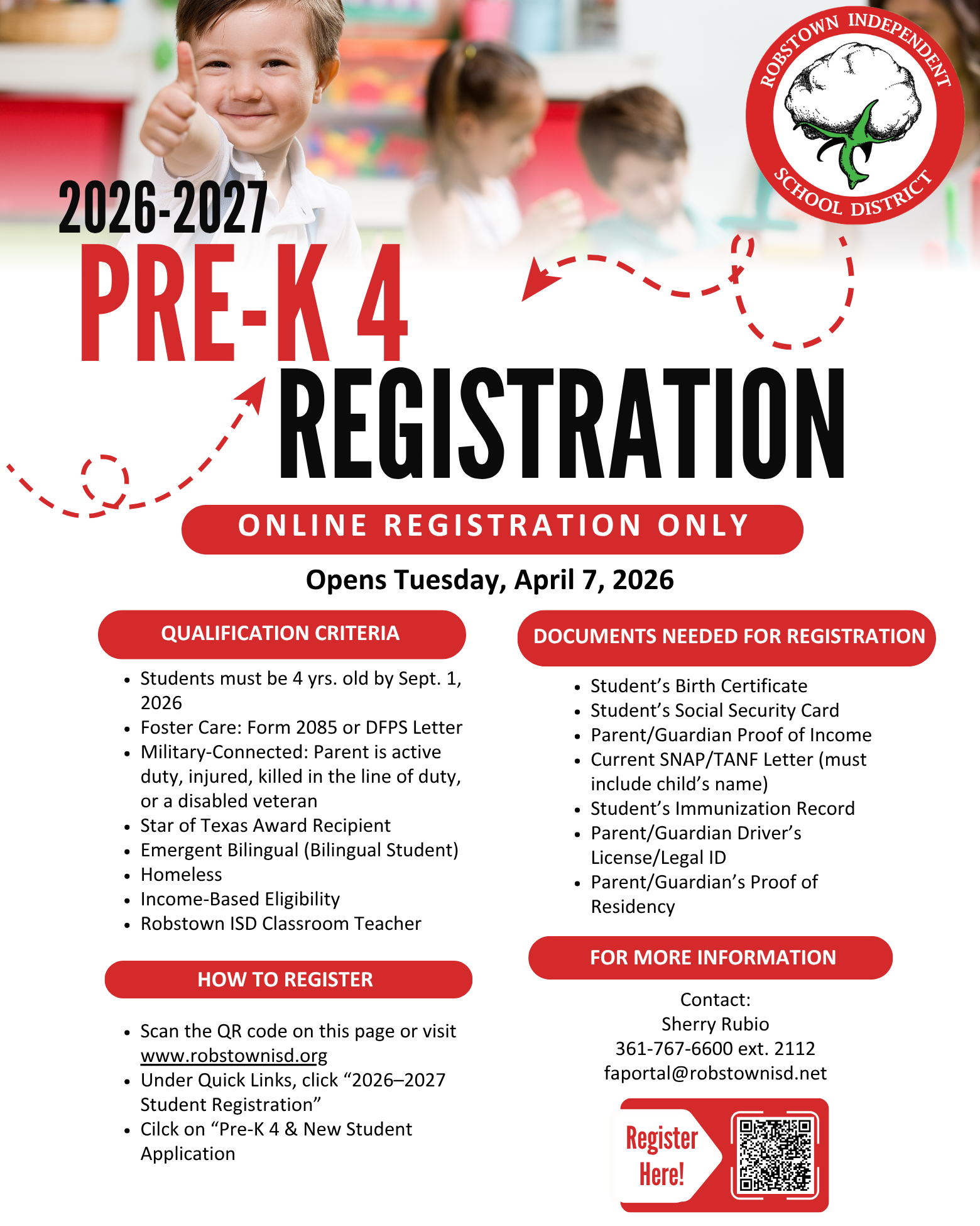 Welcome to Robstown ISD! We’re excited to serve new and returning families as we prepare for the 2026–2027 school year. Whether you are joining Picker Nation for the first time or returning for another great year, our team is here to make registration simple and supportive every step of the way. Register today to ensure your student is ready for the first day of school on Aug. 11.